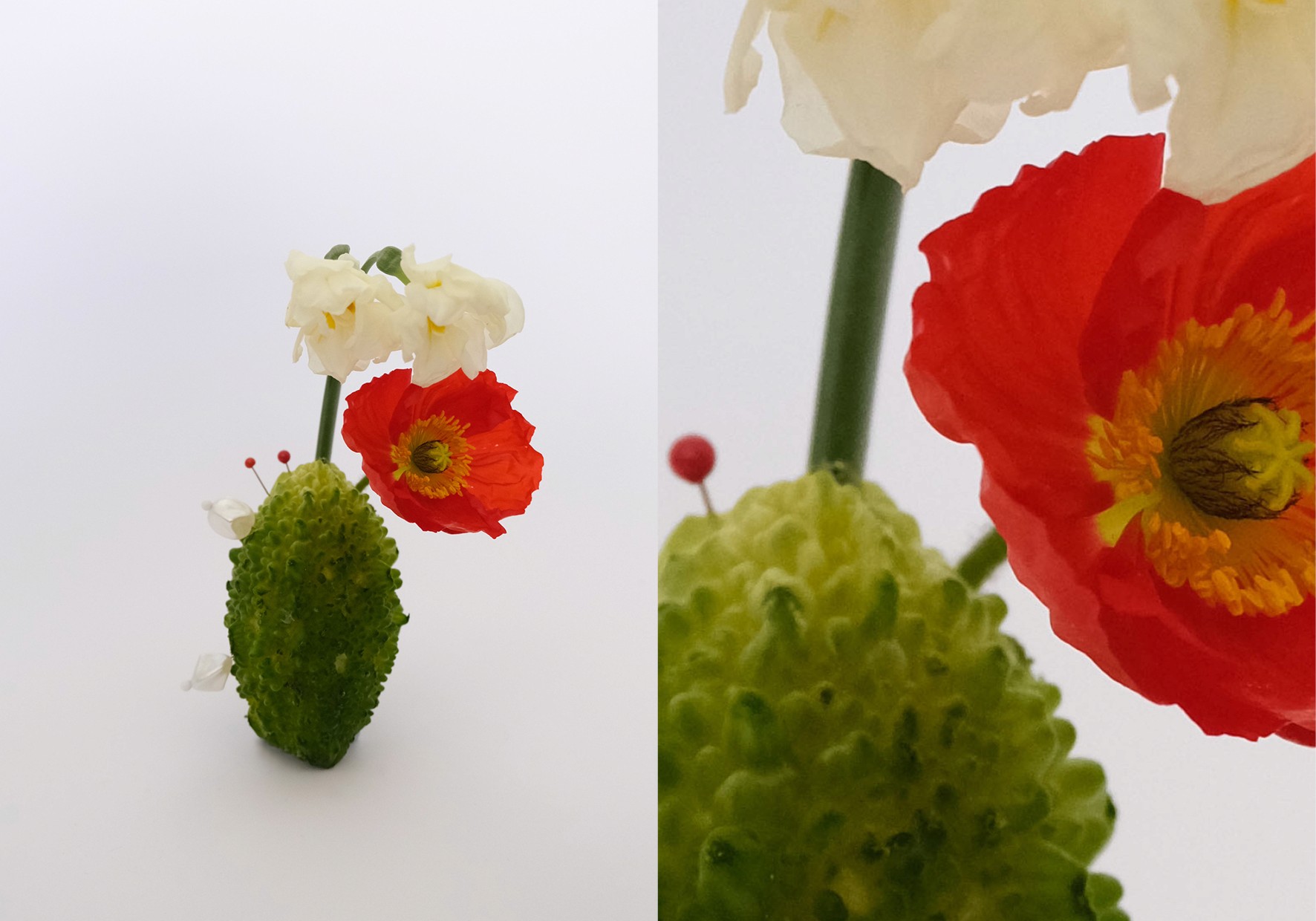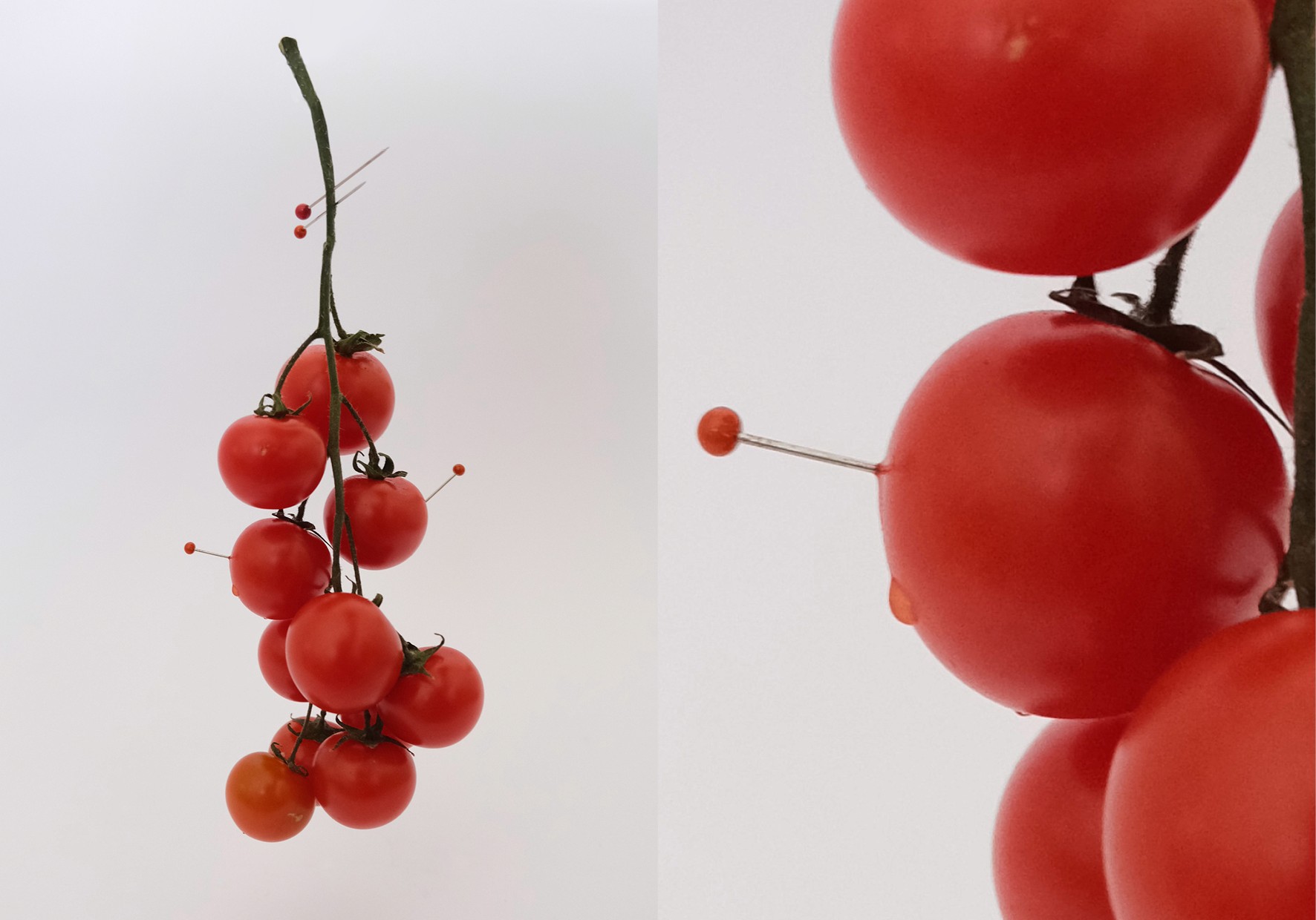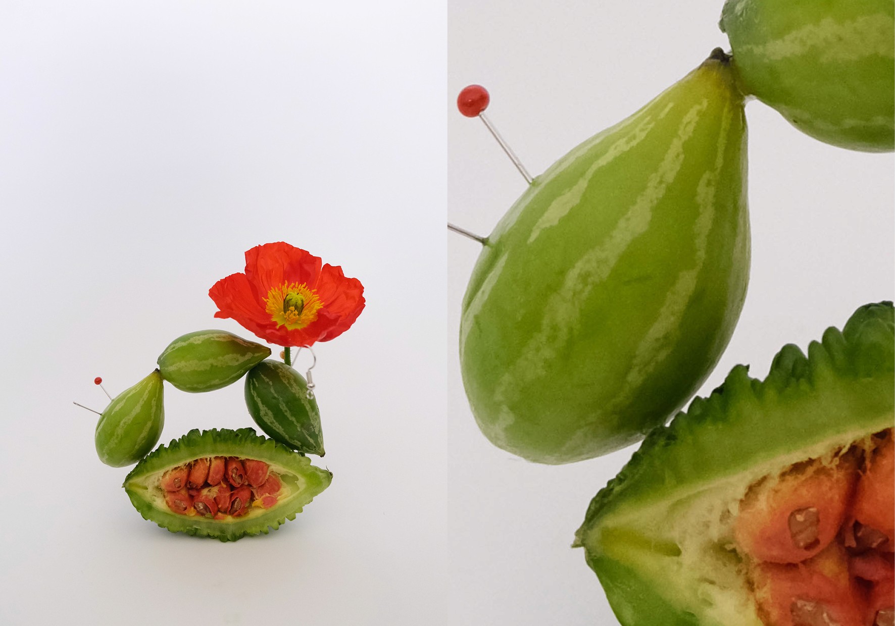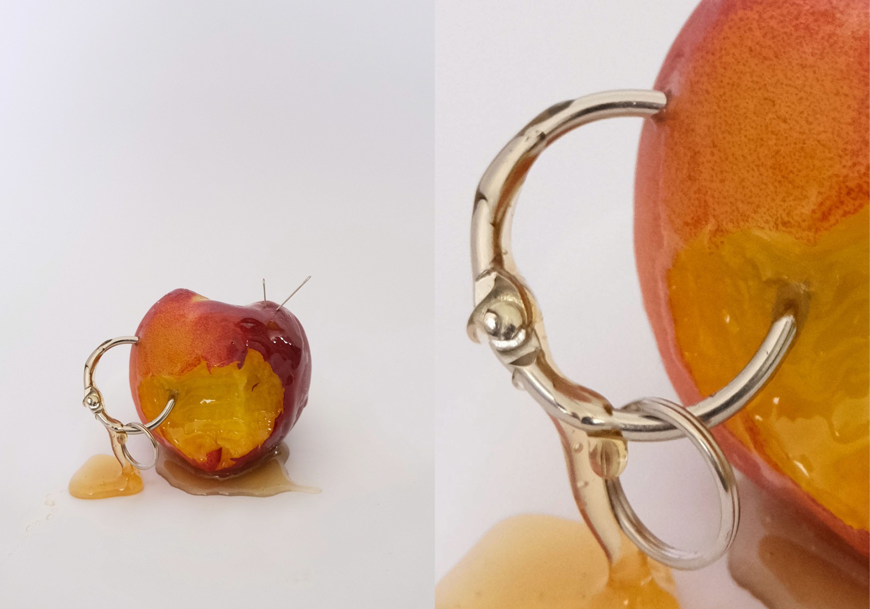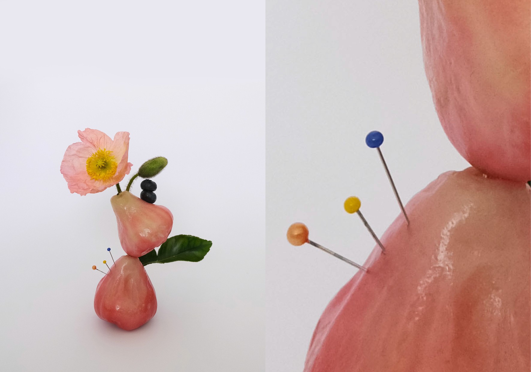 Nature, Unnatural explores the interplay between natural and artificial elements by reimagining fruits and vegetables in unconventional compositions. Inspired by Anastasia Kolesnichenko and the Loewe Candle campaign, I juxtapose organic forms with industrial materials like pins, rings, and staples to create striking contrasts between softness and rigidity. Drawing on themes of fruit as flesh and the fruits of your labour, my work examines transformation, sensuality, and desire, blurring the boundaries between nature, artifice, and the human form.