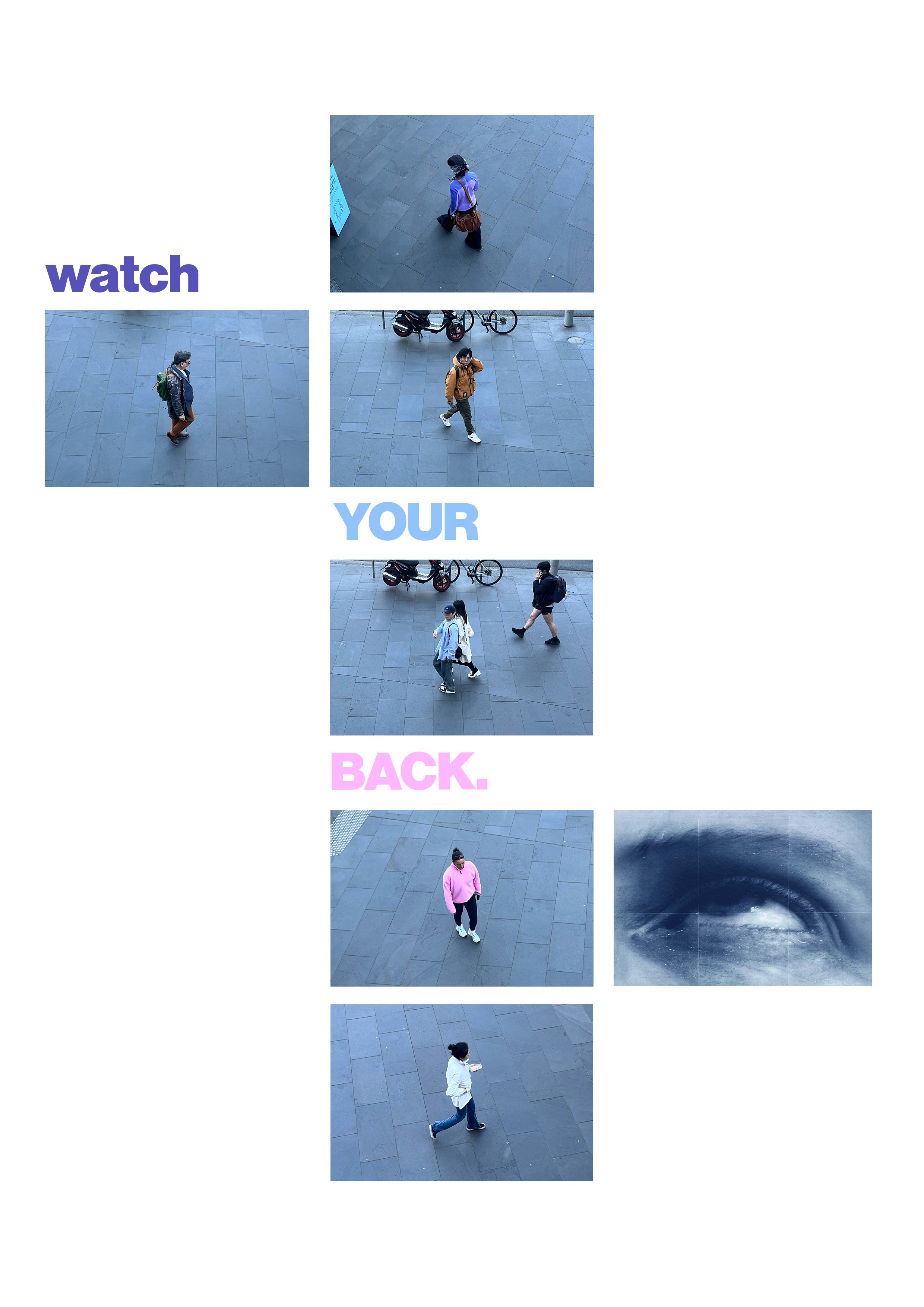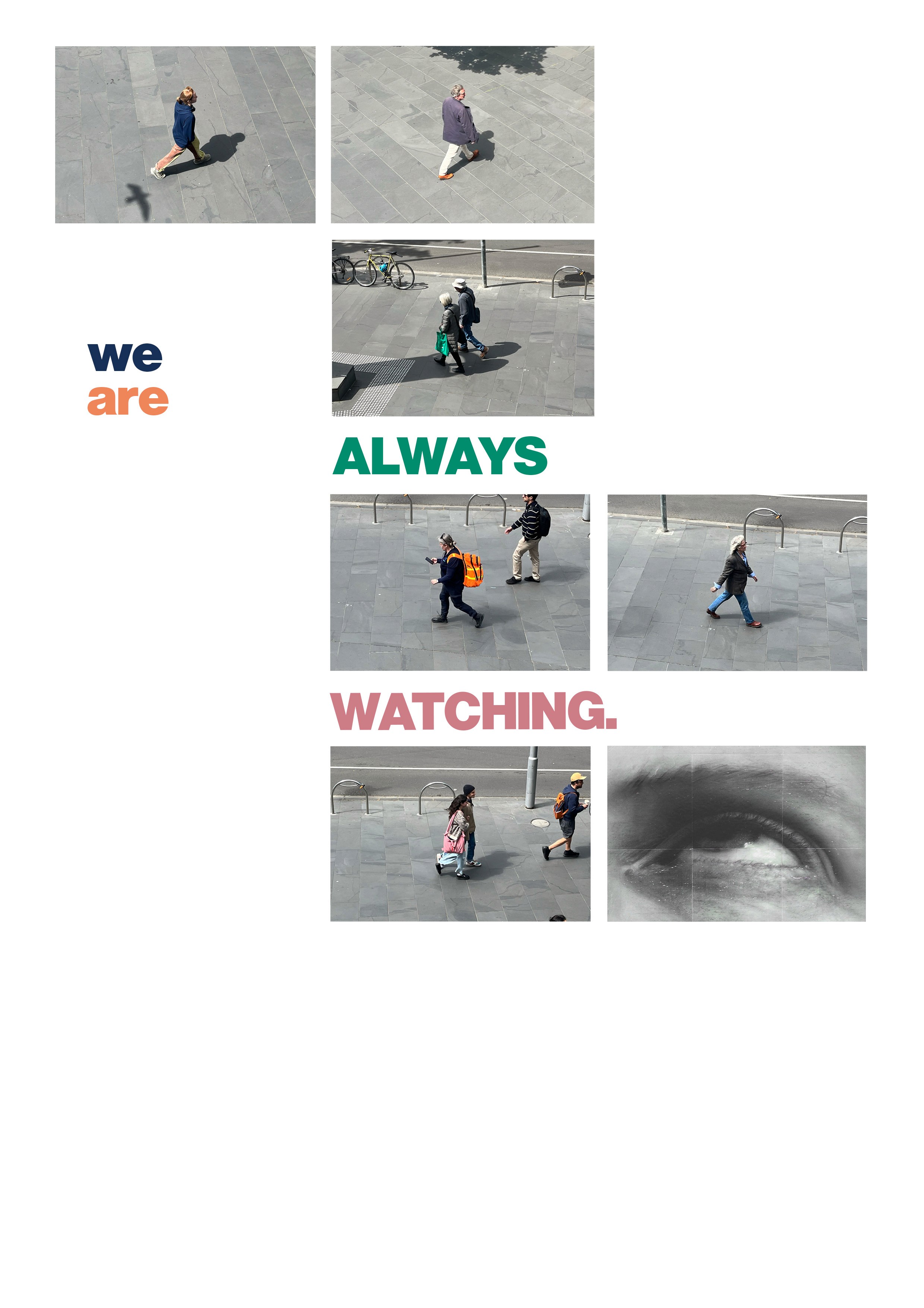 We Are Watching is a series of posters and videos that examine identity through personal presentation and colour. Captured from a balcony in the heart of Melbourne, the project documents passersby in their daily lives, highlighting how individuals express themselves through their clothing choices. Framed in the style of surveillance warnings, the work categories people by the key colours they wear, questioning visibility, observation, and the ways identity is unconsciously broadcast in public spaces.